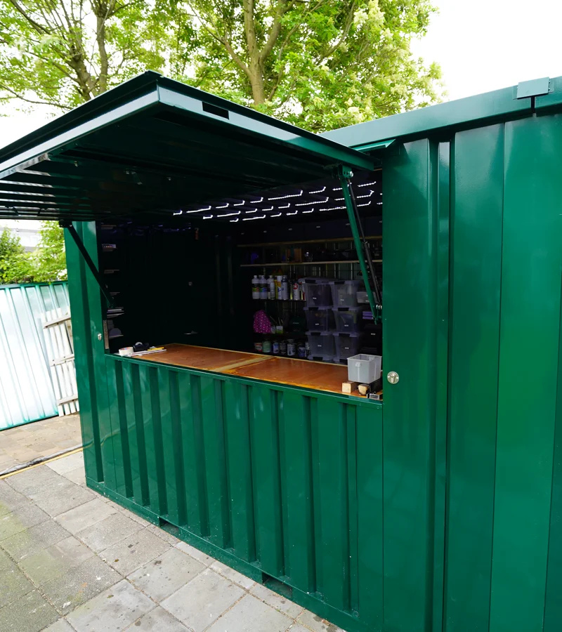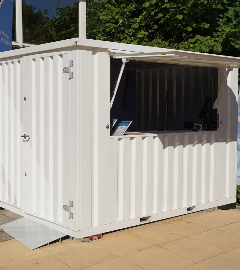 Grâce à son auvent pliable et verrouillable, ce conteneur bar offre un espace de vente sécurisé, idéal pour stocker vos équipements et produits même après l’événement.